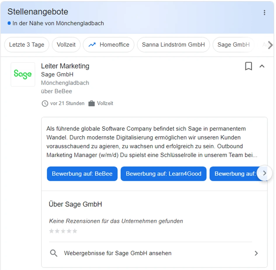 Dort, wo es etwas zu bewerten gibt, ist Google nicht fern. Das trifft besonders auf Stellenangebote und Arbeitgeberbewertungen seit 2019 zu, als Google for Jobs ins Leben gerufen wurde. Obwohl Stepstone und Indeed als führende Plattformen für Stellenanzeigen angesehen werden, beginnen mittlerweile 78 % aller Jobsuchen direkt bei Google. Und wie man es bei Google kennt, werden Treffer in der Suche gerne mit Sterne-Bewertungen angezeigt.
